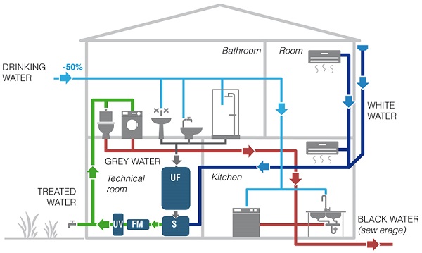 Grey water refers to domestic wastewater generated in households or office buildings from streams without fecal contamination. Sources of greywater include sinks, showers, baths, washing machines or dishwashers.As Greywater contains fewer pathogen than blackwater, It is generally safer to handle and easier to treat and reuse onsite for toilet flushing, landscape or crop irrigation, and other non-potable uses.